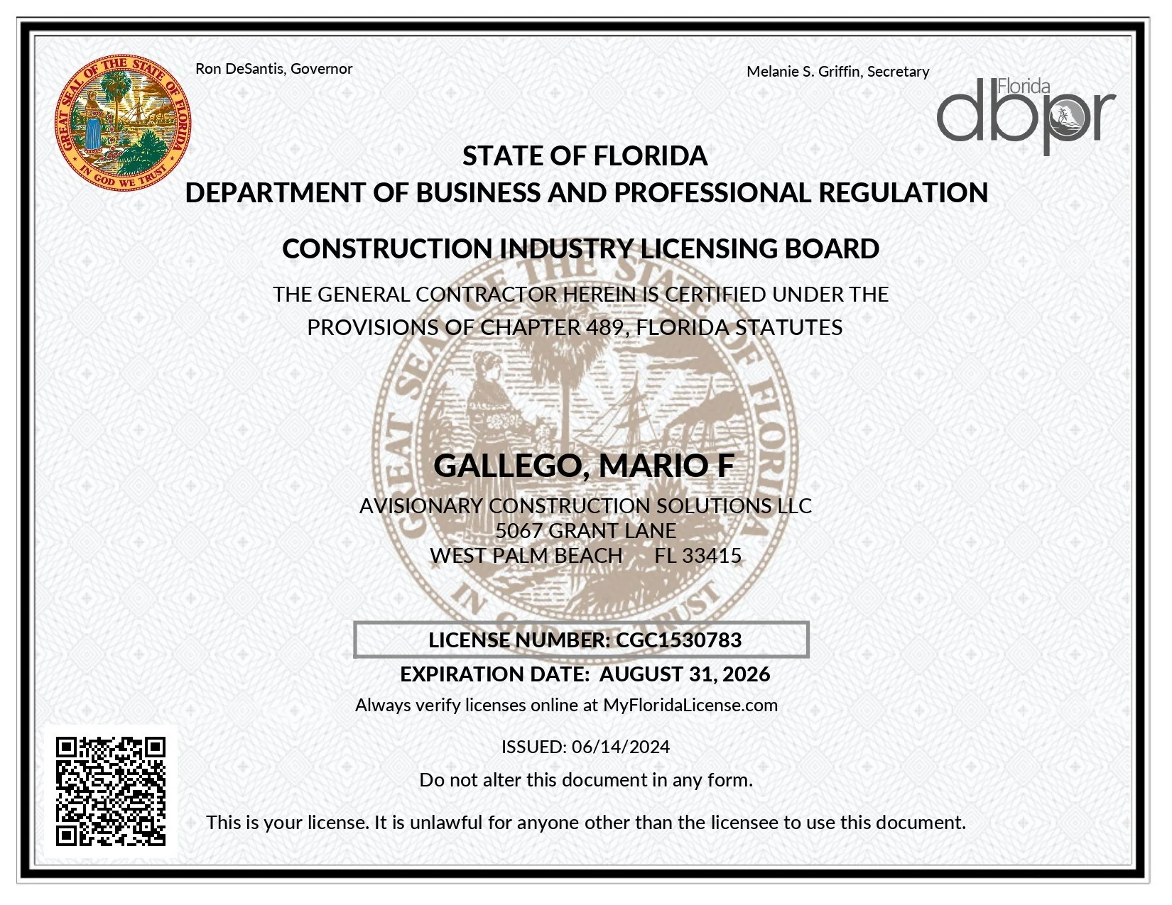 Florida construction industry license certificate with license number CGC1530783, issued to Mario F. Gallego of West Palm Beach, valid until August 31, 2026, issued on June 14, 2024, with a QR code and official seals.